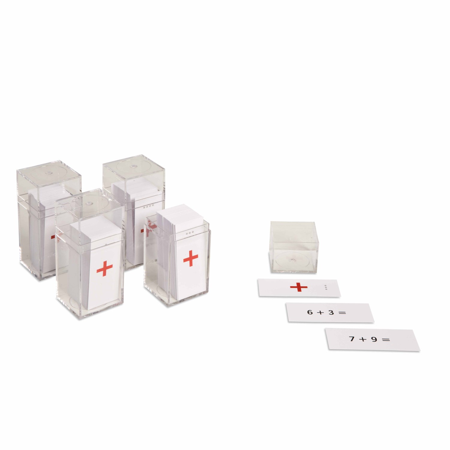 4 sets of color-coded unit addition combinations (equations) slips. 1 set of combinations for each of the 4 Addition Working Charts. Each set supplied in a separate plastic box.